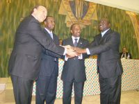Dans la salle principale du Conseil œcuménique des Églises à Genève, l’OMPP WOFP a organisé une conférence pour la paix en Afrique. Ici, nous pouvons voir Carlos Peralta, président de l’Organisation mondiale pour la paix, à côté de Thierry Legr, représentant des jeunes patriotes de Côte d’Ivoire, au centre, Bastien Dano, ministre de la Réconciliation nationale, à côté de Konaté, chef des rebelles du nord, qui dans de nombreux les occasions appelaient à la fin de la guerre et au désarmement immédiat de la population. Cet acte montrait que tous les peuples étaient unis, sans gagnants ni perdants, sans conquérants ni vaincus.